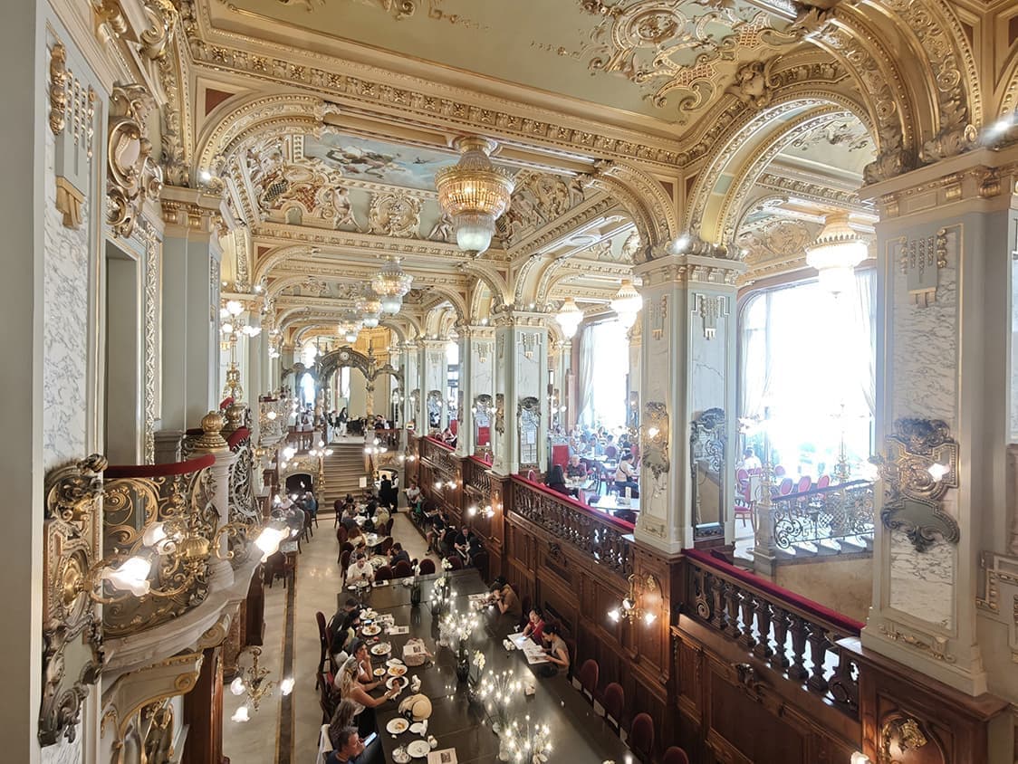 世界一豪華と噂される「ニューヨーク・カaフェ」でのティータイムは、宮殿のような装飾が楽しめる体験でした。ホテルを同立地のANANにすれば、朝食から味わえます。