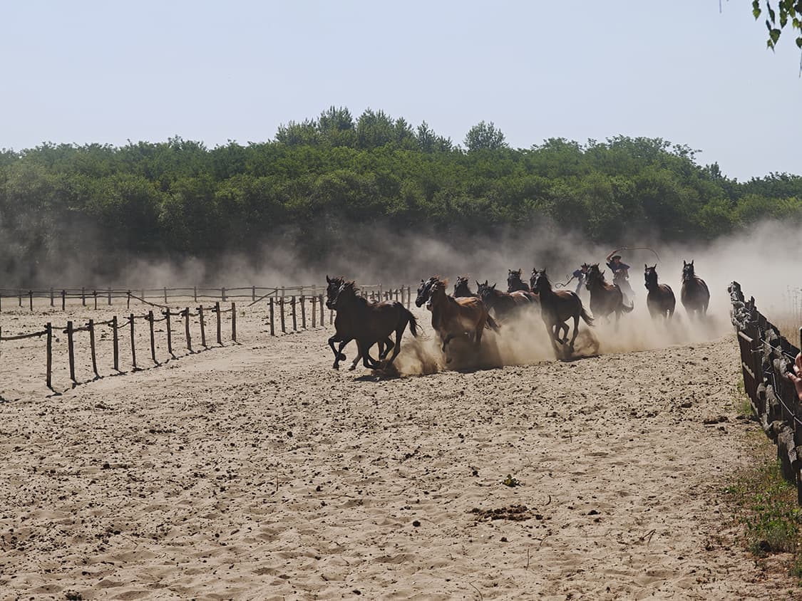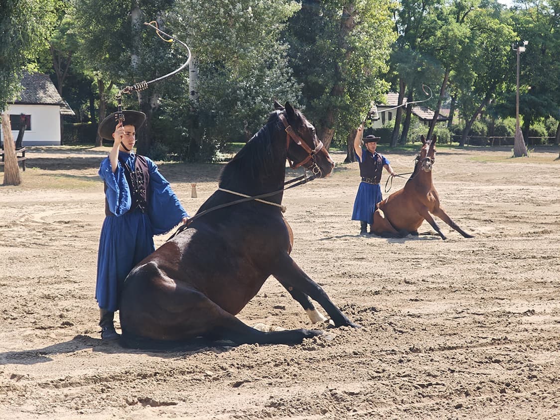 地響きを立てて駆ける馬の群れと、風に乗って聞こえる鞭の音。鞍を使わないハンガリー式の乗馬、人間と動物の昔ながらの行き方が感じられました。