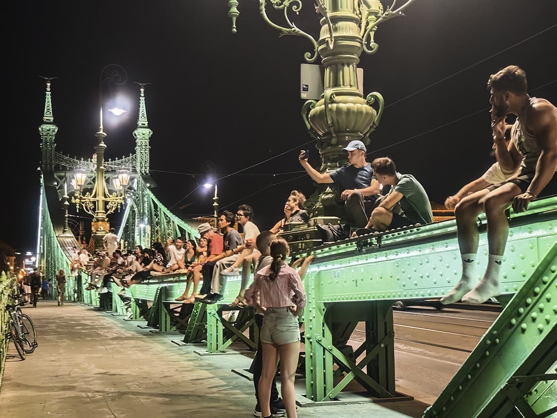 特に自由橋はトラムの線路さえも座席代わり。スーパーで買ったワインやビールを片手に、欄干に腰掛けて夜風を楽しみます。