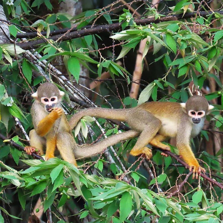 アマゾンは小動物の楽園でもあります。ボートをゆっくり走らせると、岸沿いの木が大きく揺れています「モンキーだ!それもフンボルトウーリーモンキーだぞ!」エクスペディションスタッフが、大きなアクションと小さな声で、指さします。「あそこだよ!わかるかい」望遠レンズを向けるとメガネザルのような小さな猿が集団で木々を渡っていきます。