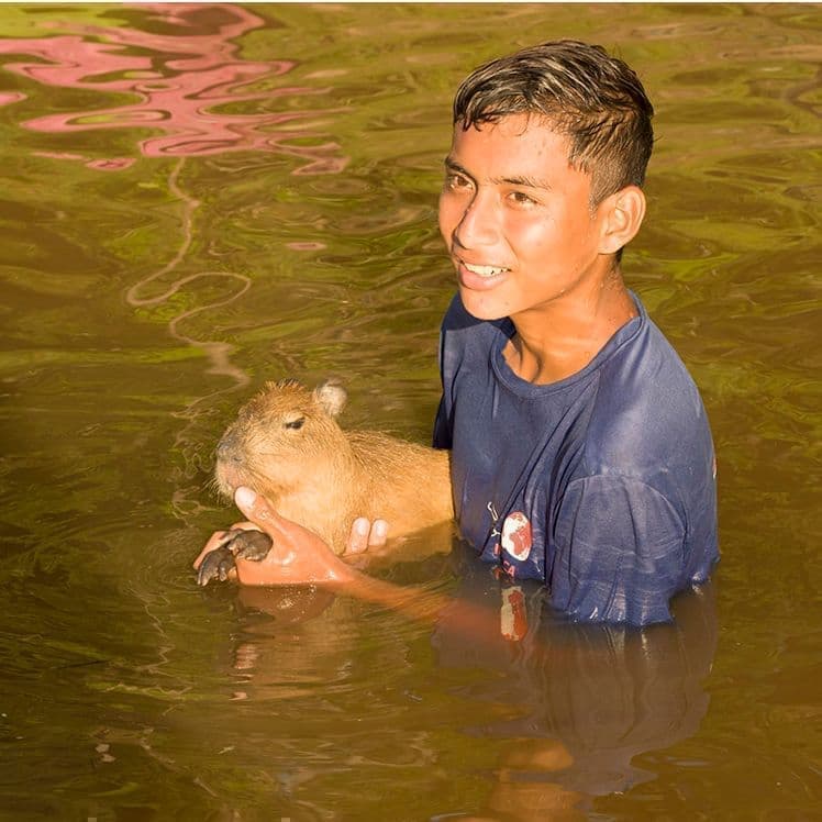 現地の子供達がカピバラと遊んでいました。ボートが近寄り「それは飼ってるの」と聞くと、「迷い込んでいたの面倒見てるんだ」との返事。まるで童話のような世界です。