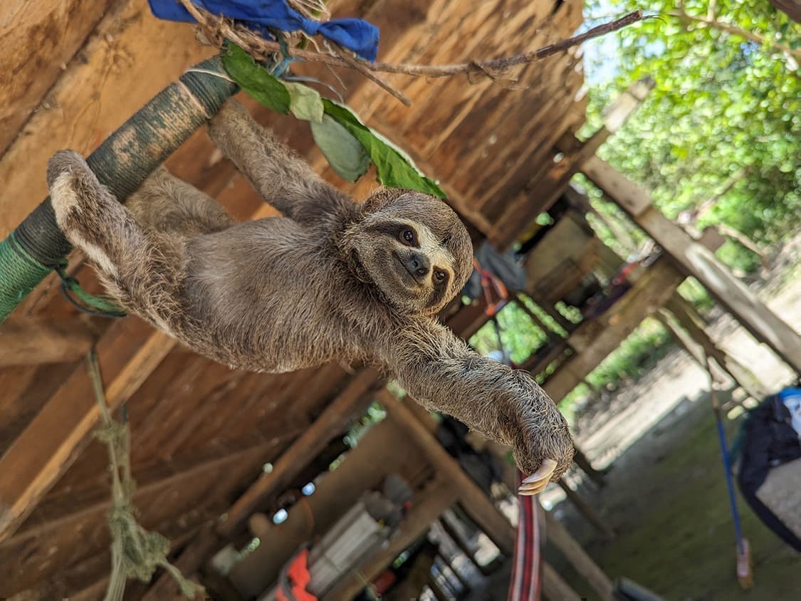 村の家の下で飼われていたナマケモノ。絶妙な可愛さです