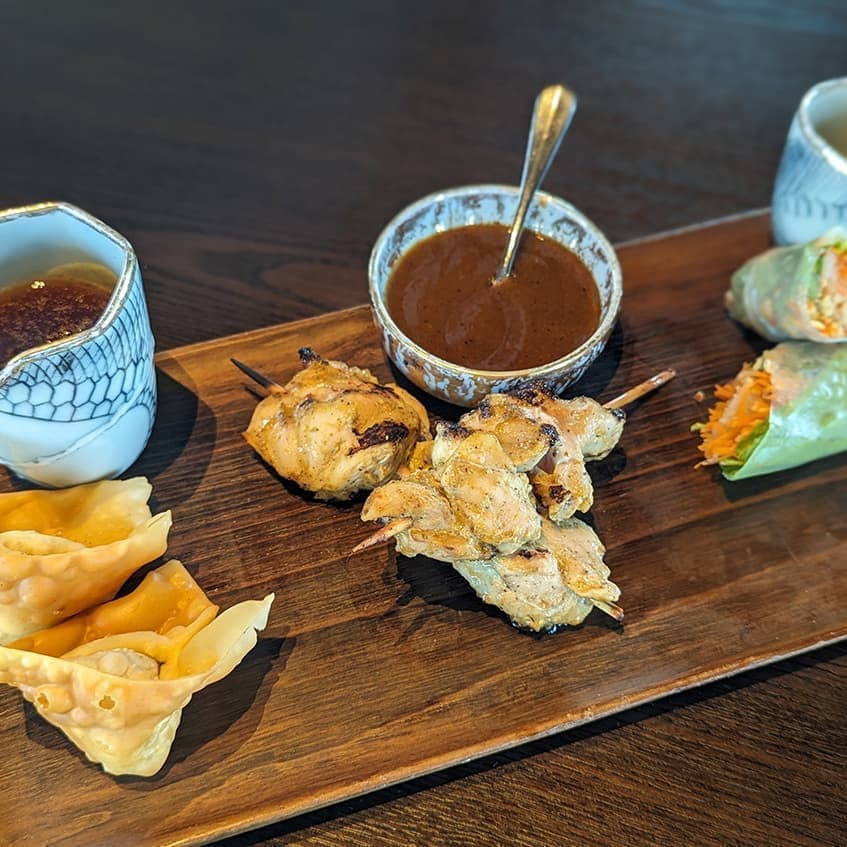 中国人の移民も多いペルーは中華料理も美味しいです。昼は揚げ春巻きに焼き鳥(ピーナッツソースをつけて食べるのがペルー式です)それに生春巻き、チキンソテーとアジア人に馴染む料理です。