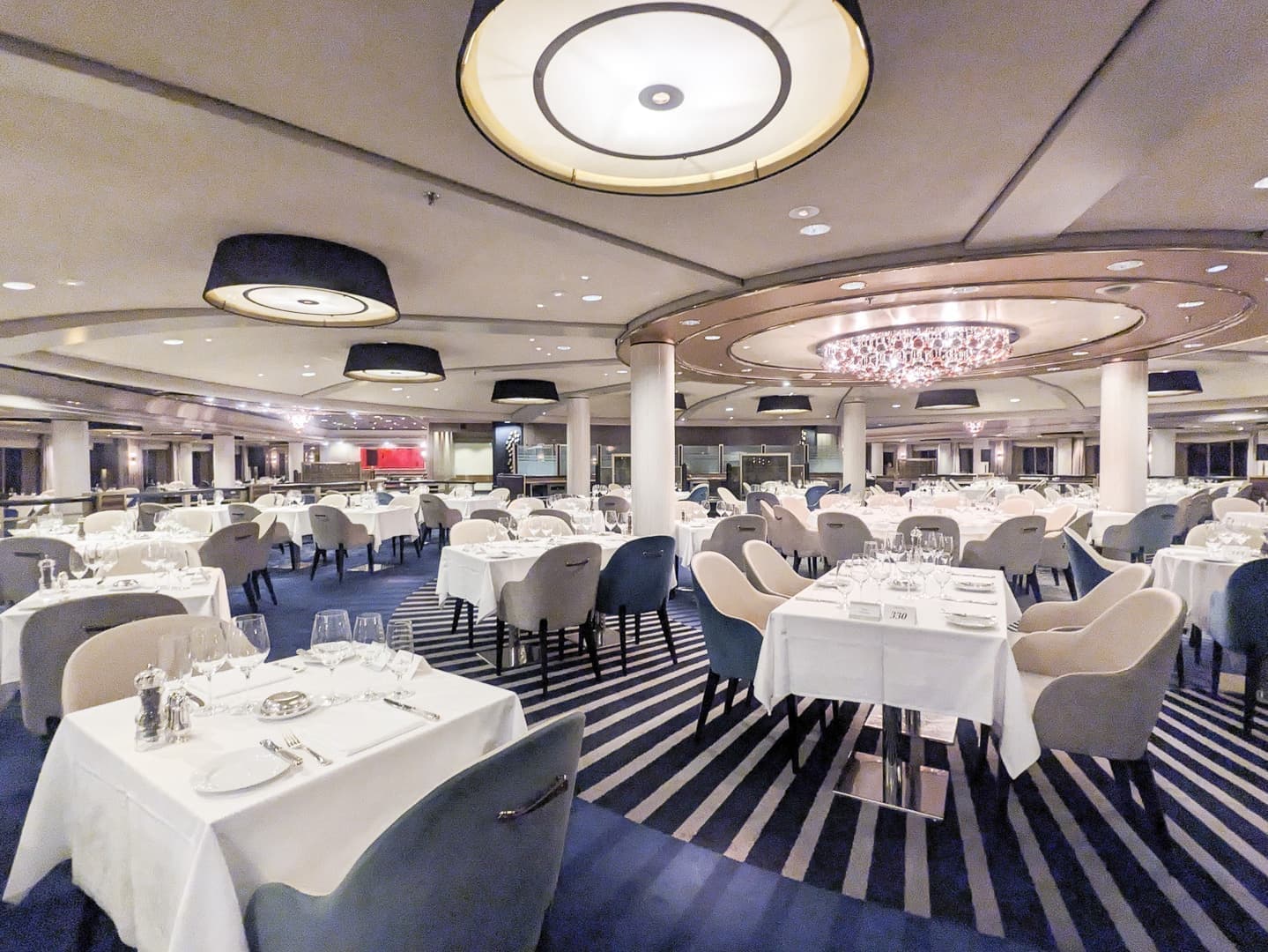 普段の食事の中心であり、ほぼ毎日数回は行くのがメインダイニングです。そしてガラディナーもこちらです。インテリアは飛鳥II同様の、豪華と落ち着きが併存している居心地のいい高級感があります。あまり細かいことを書いてもしょうがないので、料理の写真を中心に紹介します。