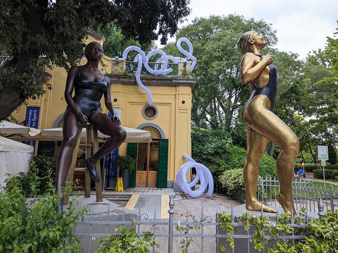 午後ビエンナーレ、具体的な知識もないので、チケット販売所でメインエントランスを聞いて行きました。現代アートなんですね。個人的には現代アートって、表現の試行錯誤ではないかと思っているのと、あまり明るくない印象があり、好意的ではないのですが、それでもこれだけ大量に表現を受けてみるのは、いい経験でした。色使いとか、空間作りとして参考になることが多々ありました。屋外展示で金色の体で胸を張った水着のお姉さんの像とか、何を表現しているのかさっぱり分かりませんが、わからない世界が多くあるのは当たり前です。