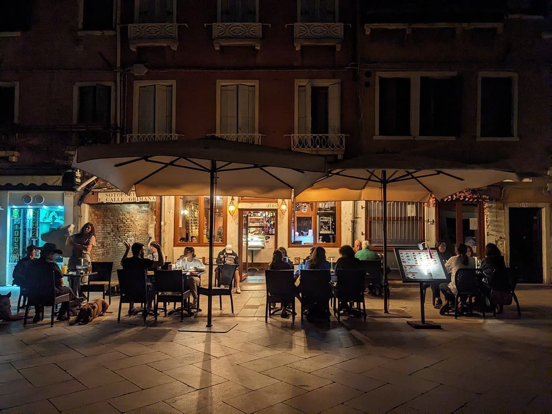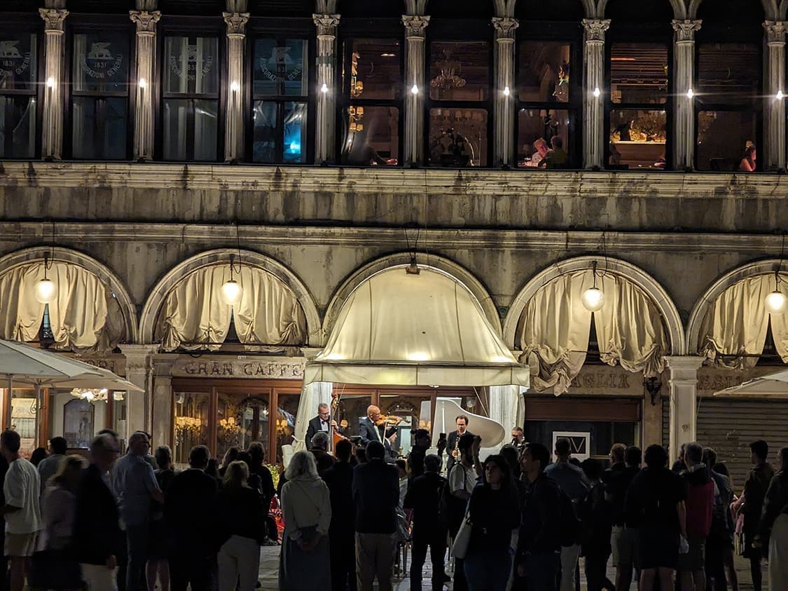 夜、サンマルコ広場のカフェは投げ銭的なコンサート会場となります。基本的には屋外席に座ったお客さんへのBGMですが、演奏を気に入った立ち見のお客さんが、次々にお金を入れていました。