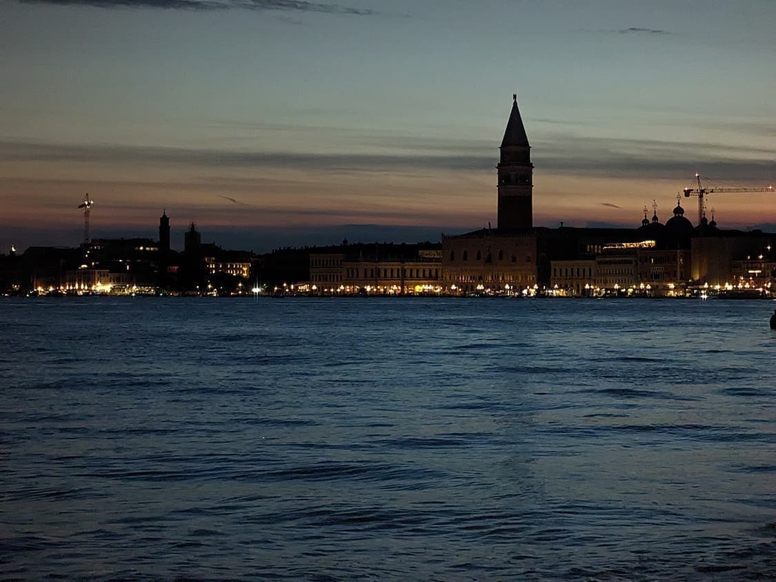 ベネツィア本島への帰路は、雲が切れて真っ青な空の下のクルーズです。サンデッキに出てのんびり日光浴をするのも良し、ラウンジでダンスを踊っているカップルもいて、幸せな時間です。