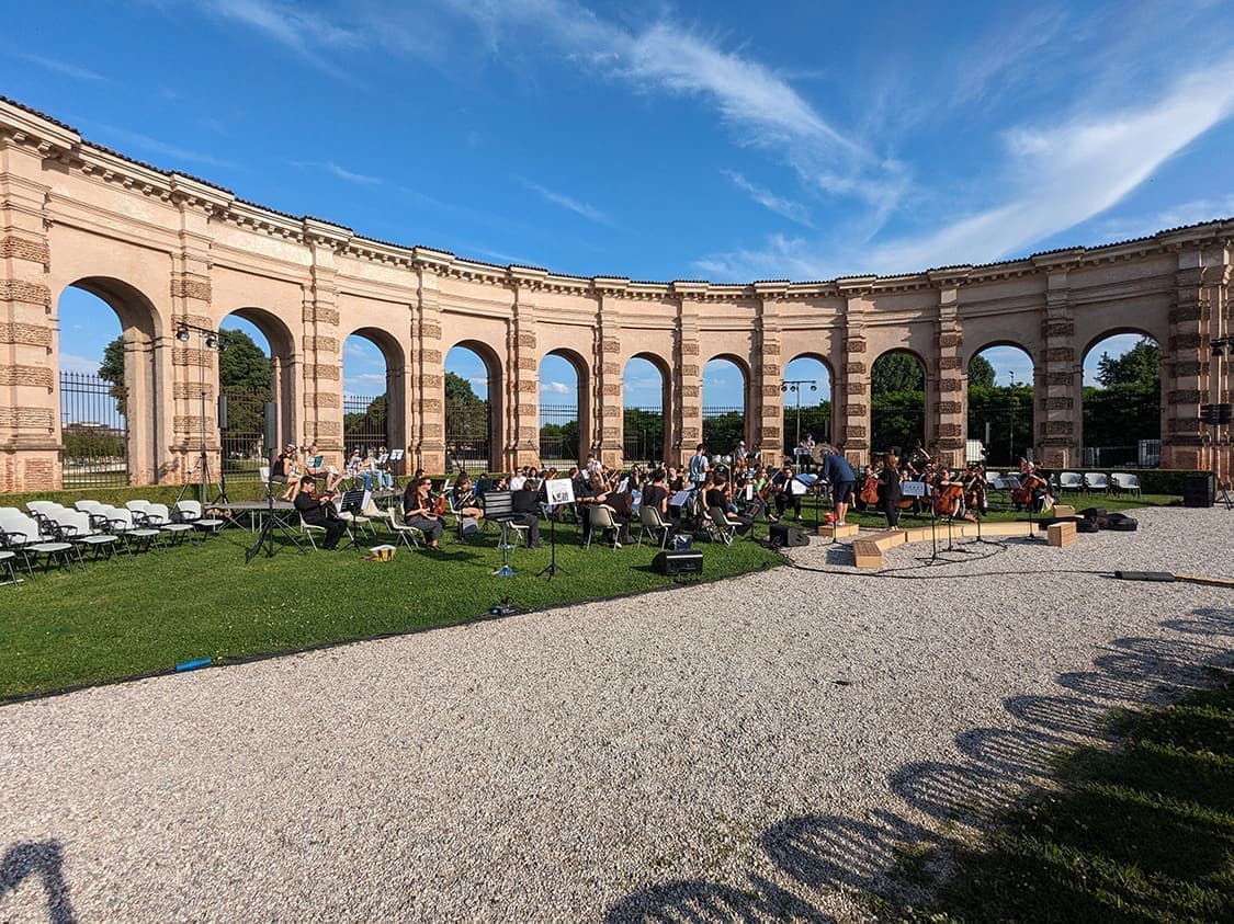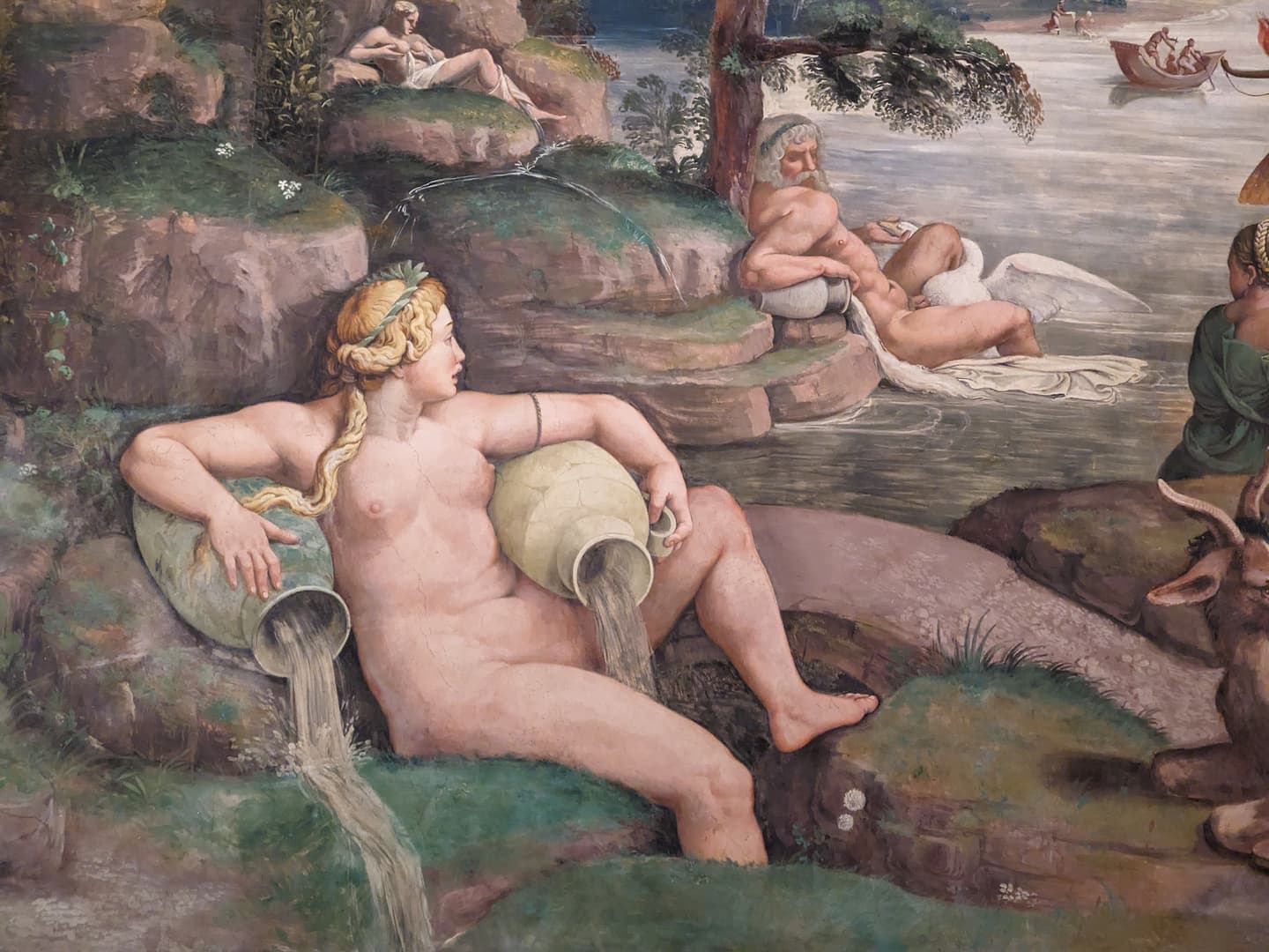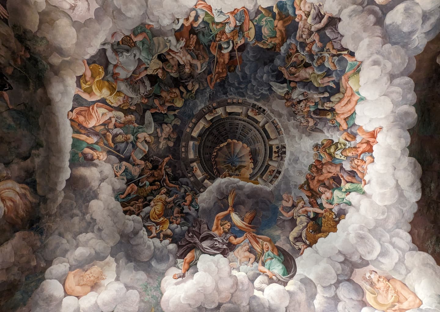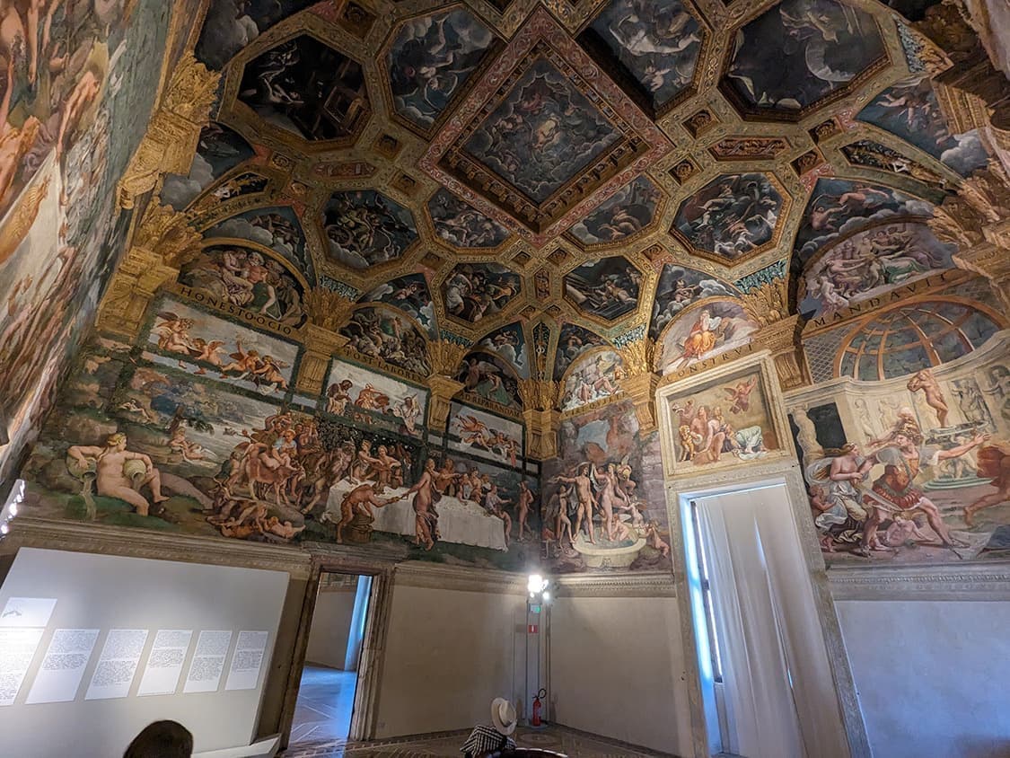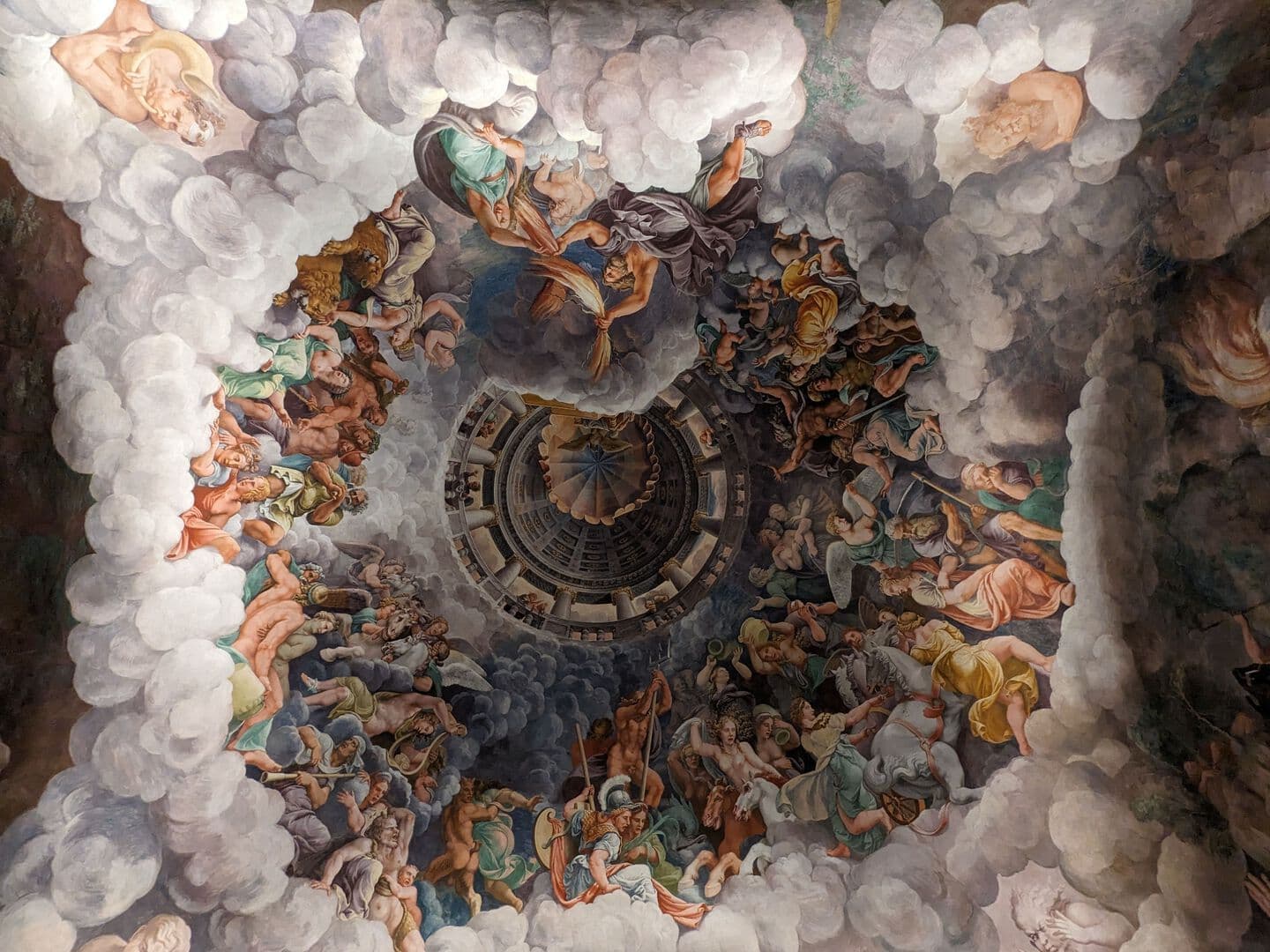 この日、訪ねたのはテ離宮です。バチカンとフランス王が対立していた世相の中、文化的水準の高さで中立を維持してマントヴァ侯国を維持しようという政治手腕の具体的な実像として建てられたものだそうです。部屋の壁という壁が立体的に見えますが、実際には立体的に描かれたフレスコ画だったりします。ですがこれだけ立体感のある絵画が凝縮した空間というのは初めての体験でした。
