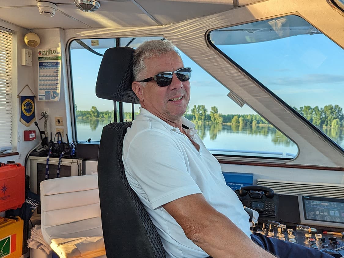 早朝からミケランジェロはマントヴァに向かいます。朝起きるのは、決してエンジン音がうるさいからではなく、ワクワク感からです。屋上デッキに上がると、やはり朝日が上ったばかりです。キャプテンが操船し、スタッフが脇についています。