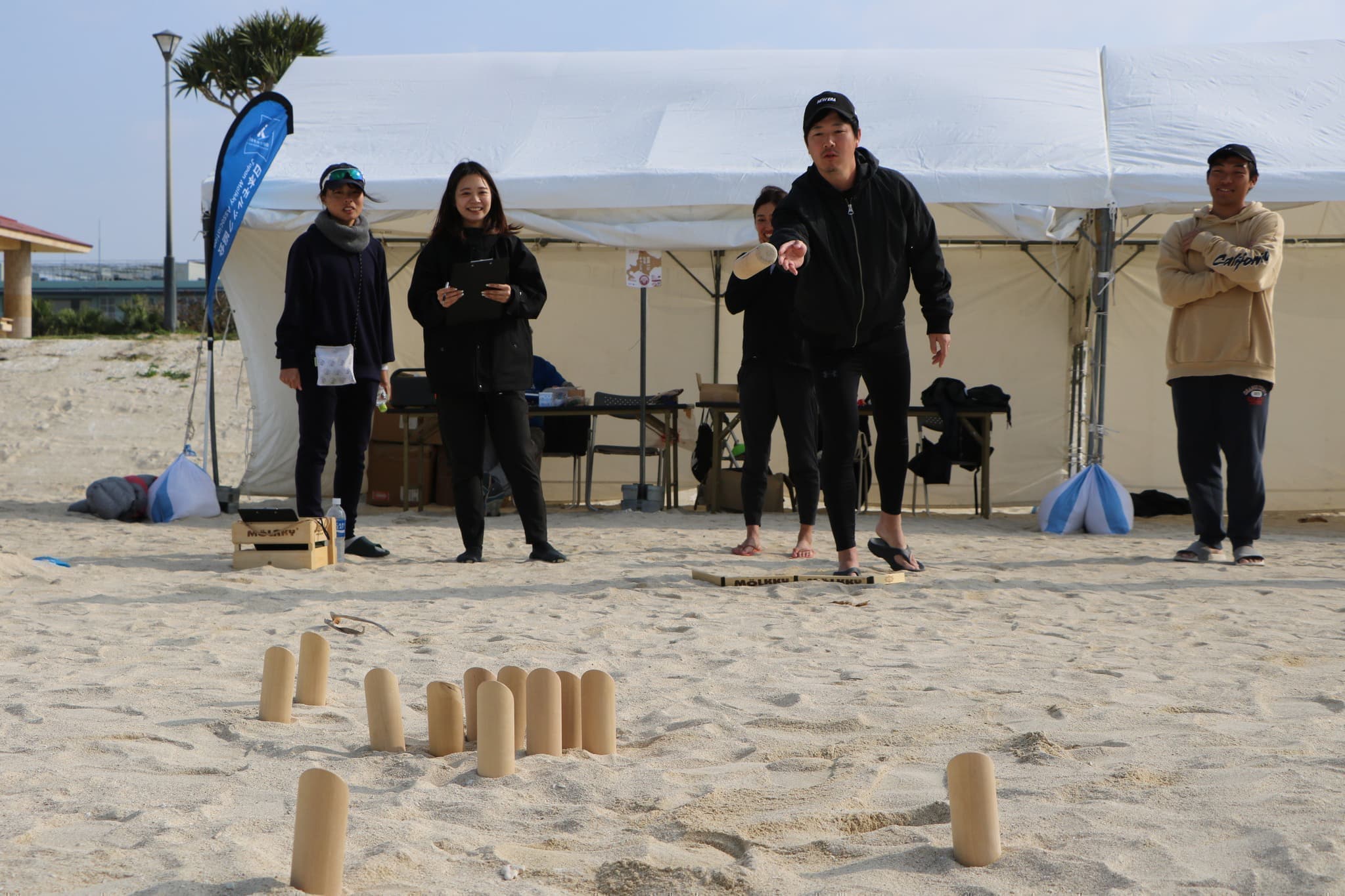 ビーチで行うモルックが「ビーチモルック」。通常のモルックに比べてスキットルがばらけず、ビーチならではのプレーを楽しむことができます。