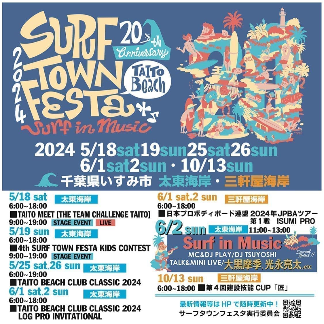 「サーフタウンフェスタ2024」は、2024年5月18日(土)から6月2日(日)まで、千葉県の外房に位置する「いすみ市」で開催されるサーフィンの一大イベントです。また、特別なコンテストが10月13日(日)にも予定されています。