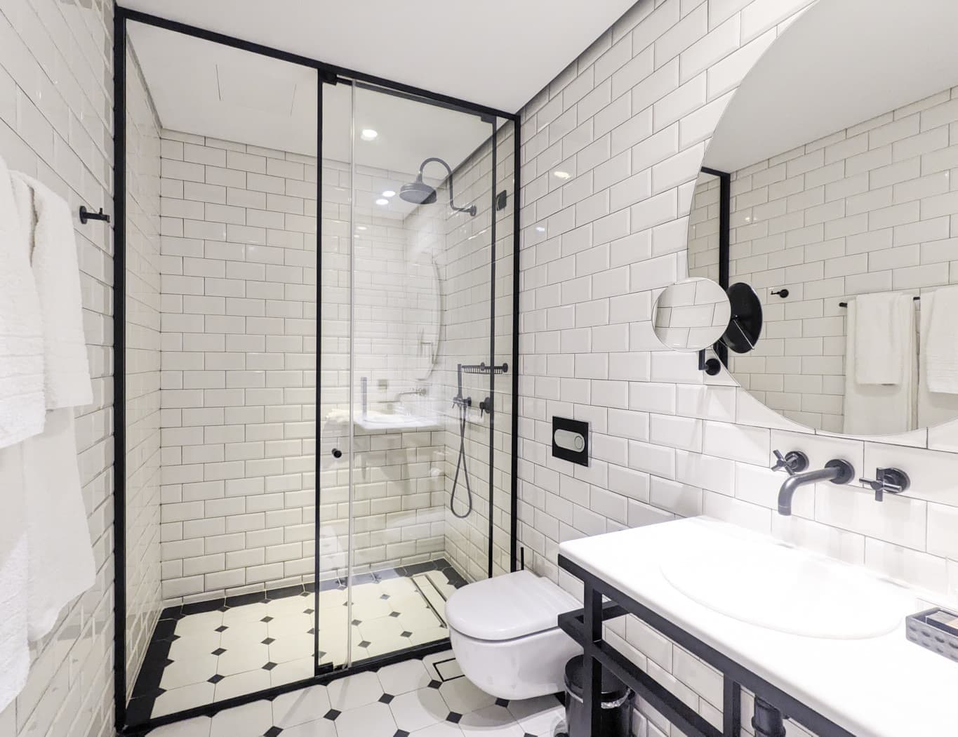白いタイルの壁で覆われた少し広めのバスルームは清潔感があり好感を持ちました。白と黒のコントラストがある床。余計なものが置かれていません。やや高い天井近くのシャワーとスティックスタイルのシャワーは、壁のレバーで切り替え・調整します。水圧はまあまあ、水道がお湯になるまでもすぐでした。