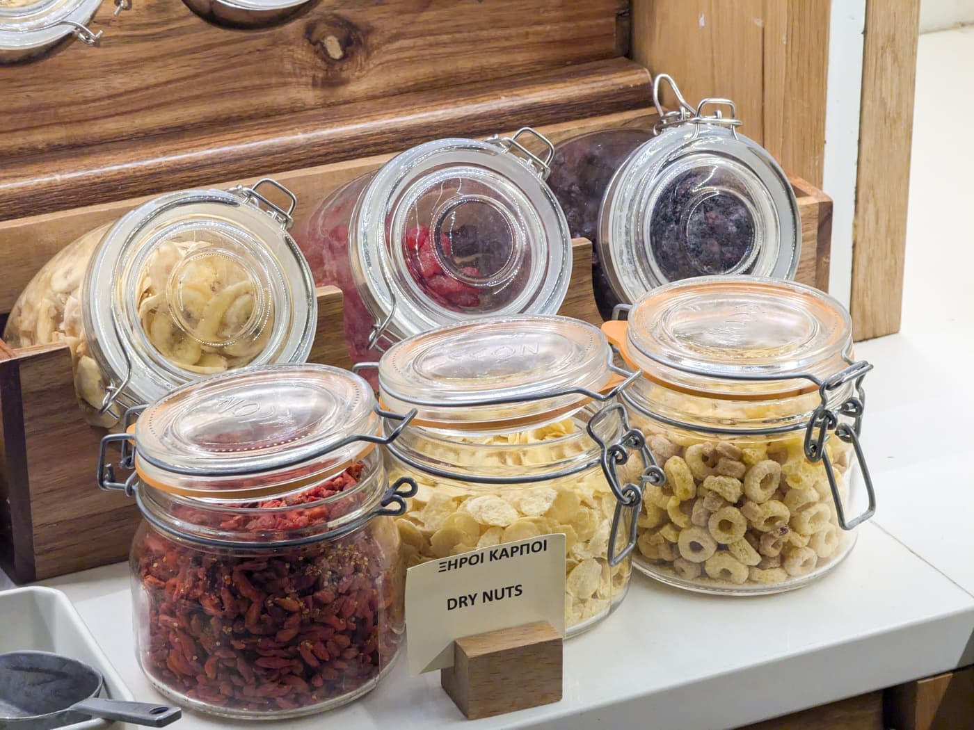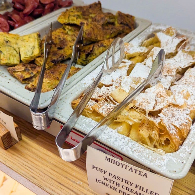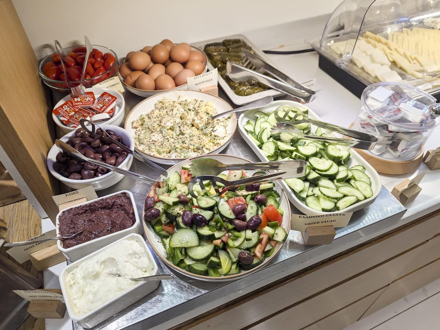 さすが地中海のアテネ、ヨーロッパでは朝食にあまり出てこない生野菜もあります。チーズもあって自分でグリークサラダが作れます。選べるシリアル系もありました。