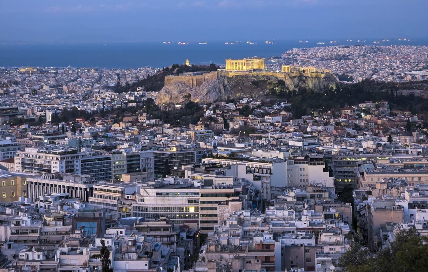 登山道からはアテネの全景が見えてきます。南側にはパルテノン宮殿がライトアップされて、その先には地中海とピレウスの港が見えます。