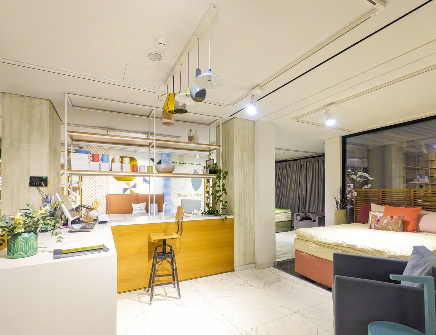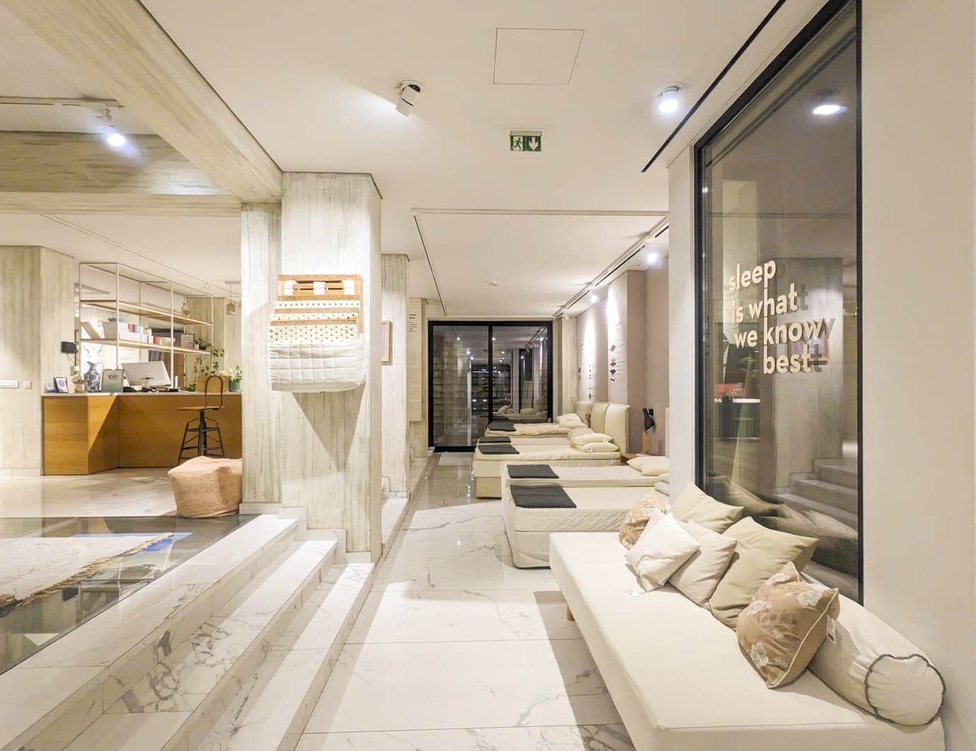 COCO-MAT HOTEL ATHENSのドアを開けると、ベッドが並んでいます。家具のショールームのような入口で、どうしようか考えていると、スタッフさんが声をかけてくれました。宿泊のチェックインですか?と。Yesと答えると荷物を持って案内してくれました。