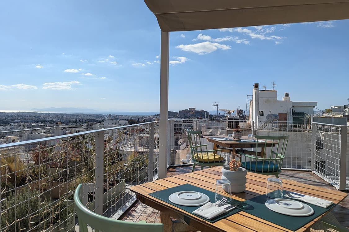 パルテノン神殿が見渡せる屋上のテラス、絶景です。