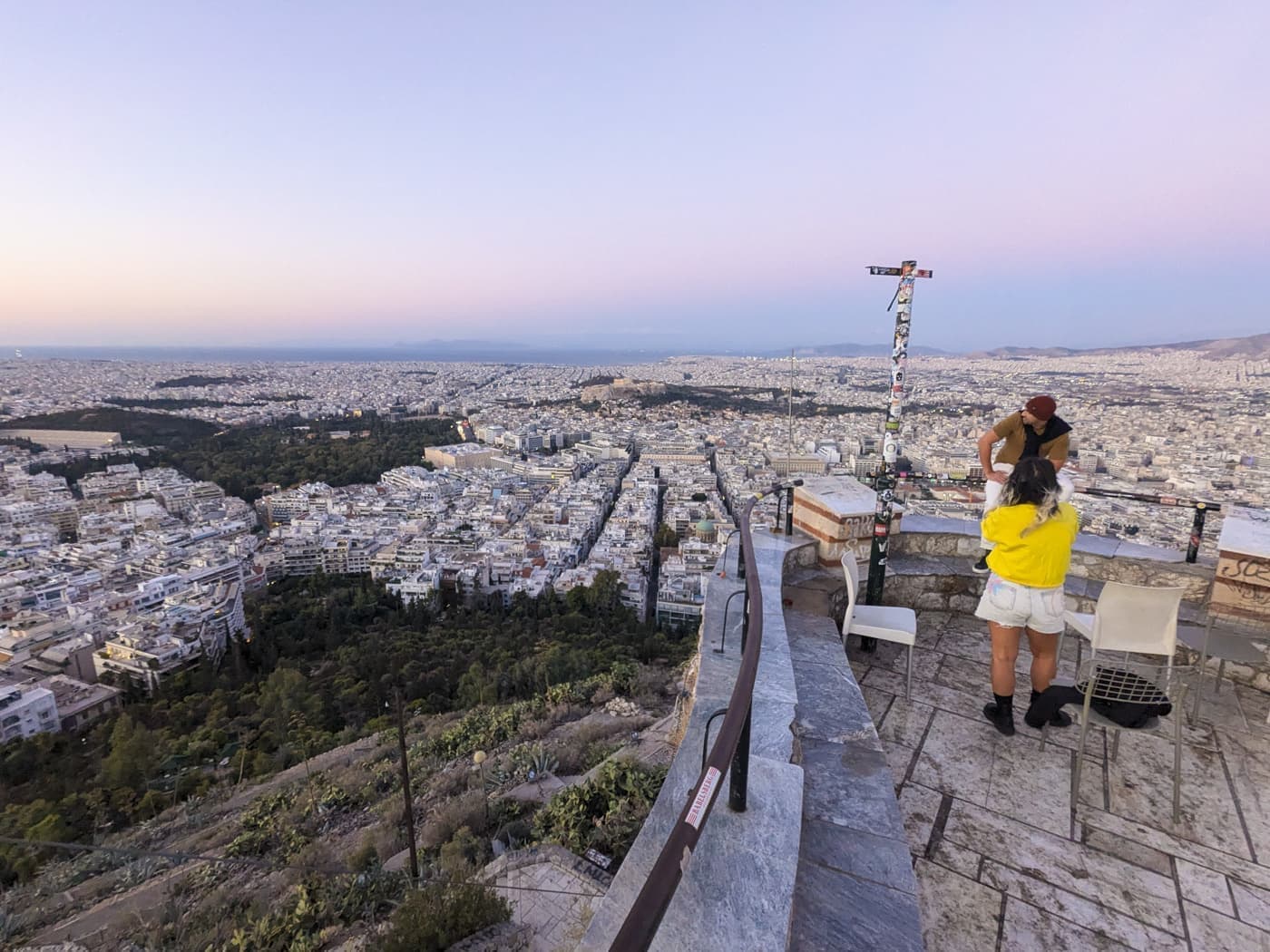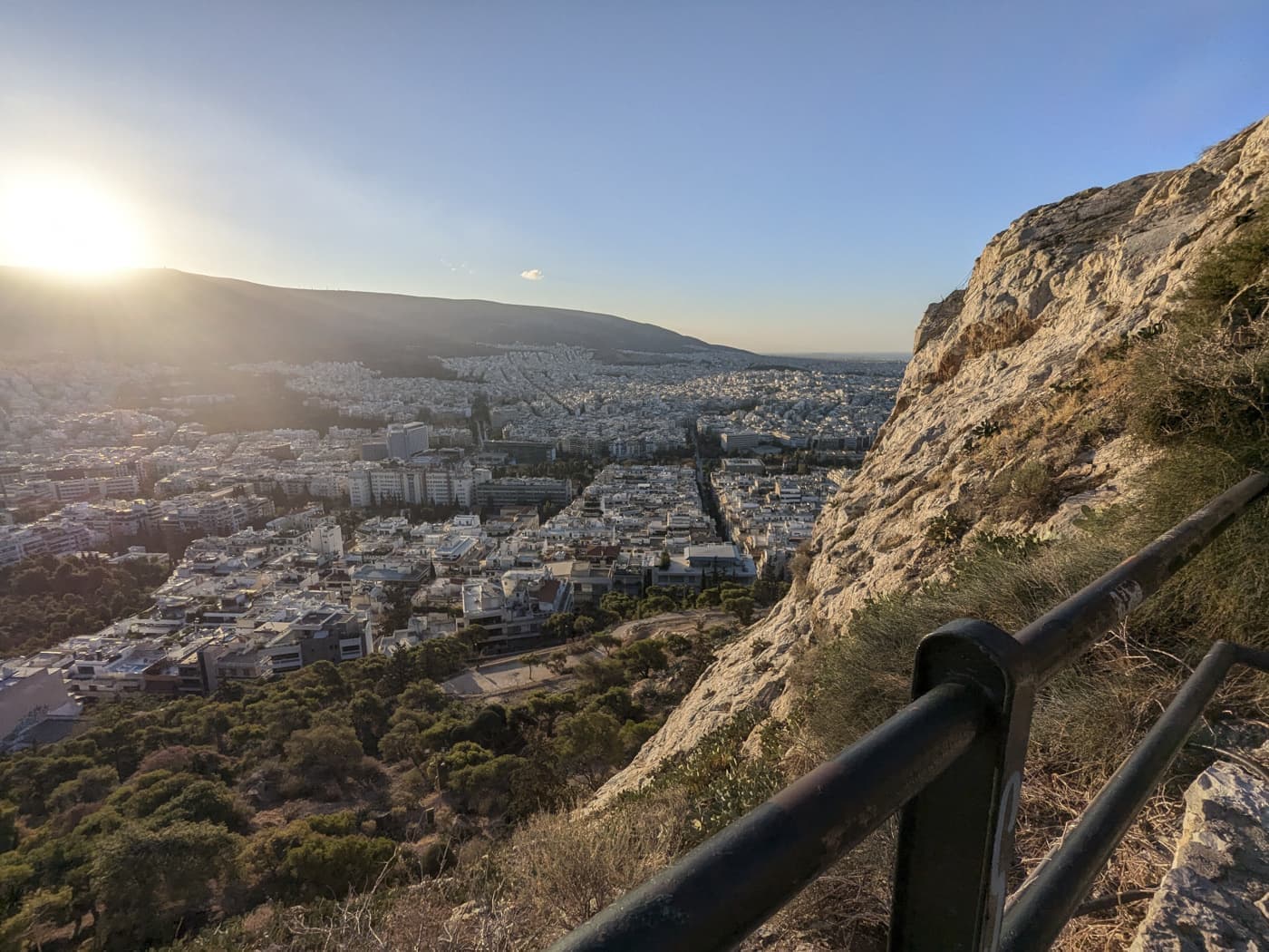 地平線に青からピンクに変わるグラデーションがかかった風景を堪能しつつ日の出を待ちました。午前7時20分くらいに東のイトミス山から太陽が顔を出しました。西を見ると海の方からアテネの街がゆっくりと光りはじめていきました。