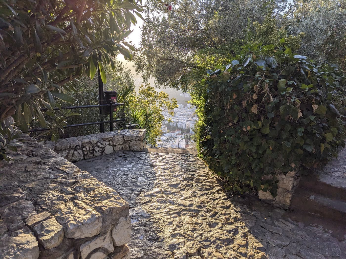 教えてもらったルートは住宅街を抜けるまで、ほぼ直登の階段が続いていました。アテネ前に運動していたから、苦しくはなかったですが、十分に体は温まります。建物がなくなる高さまで来ると直登ではなく、アスファルトで固められた登山道になりました。