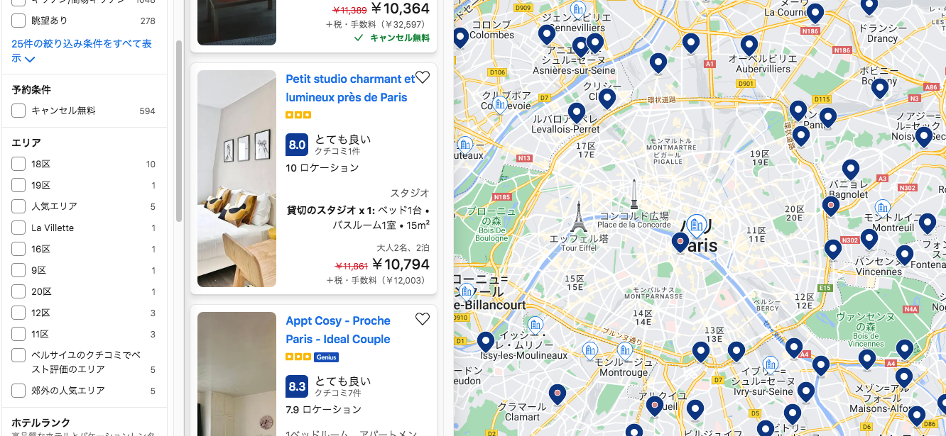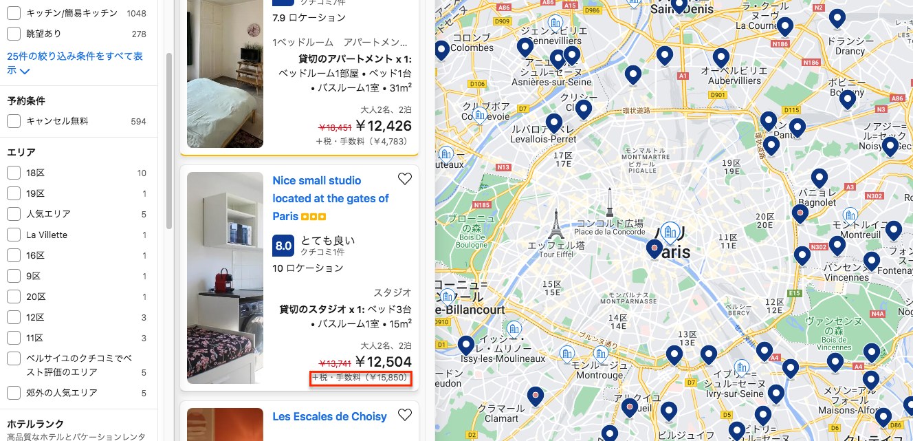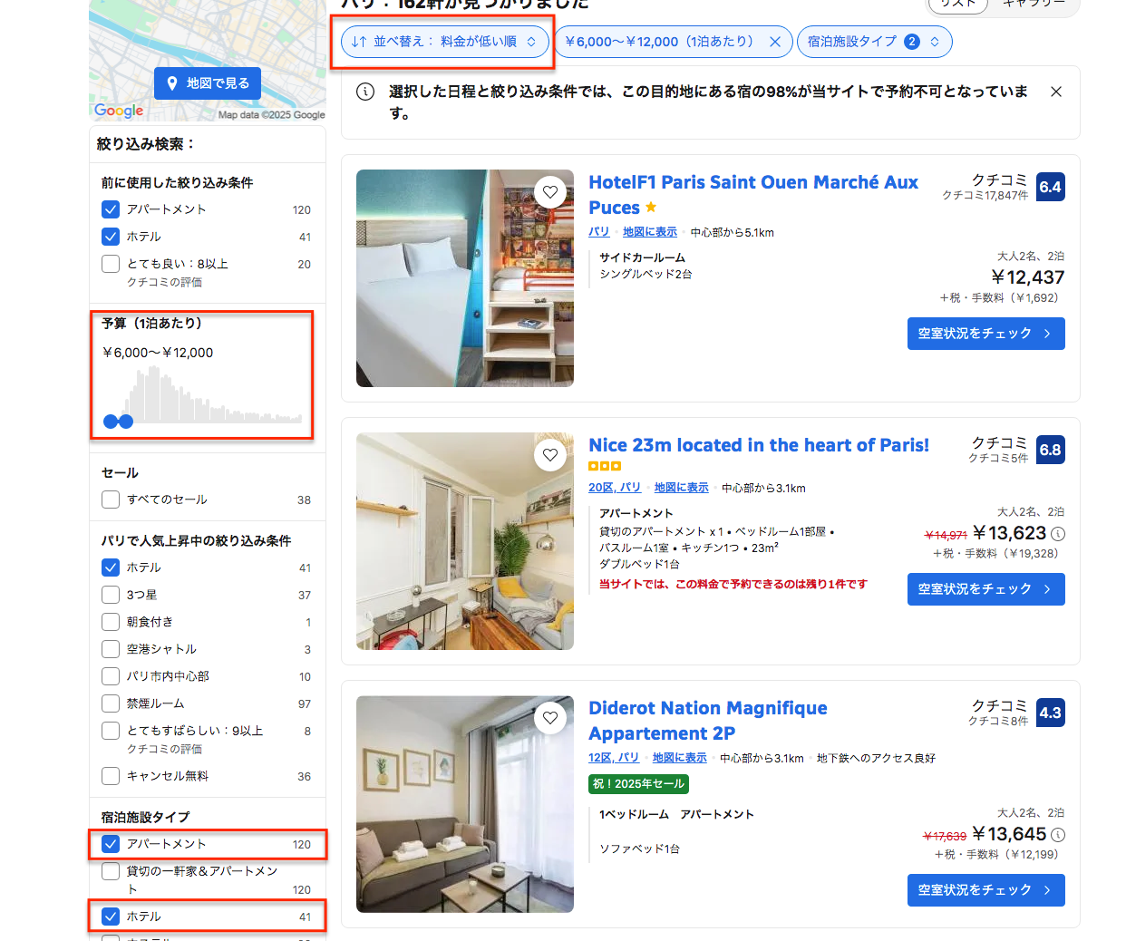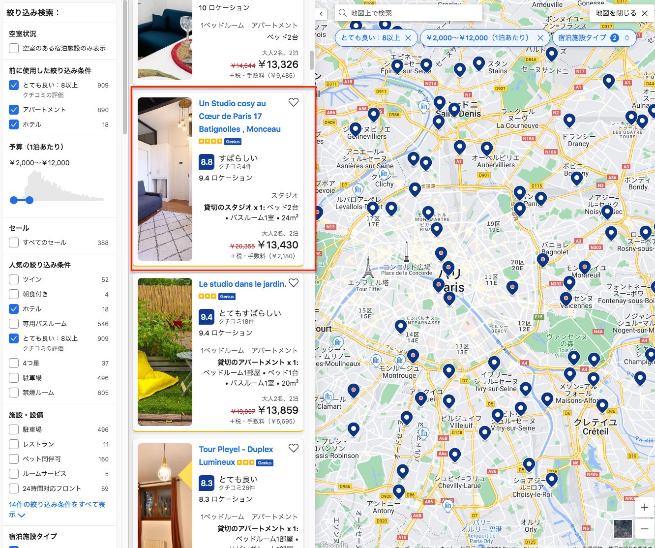ここで条件設定を使い、予算上限は12000円/泊、宿泊施設タイプをアパートメントとホテルに絞ります。そして宿泊者の評価は8.0以上で絞り込みます。