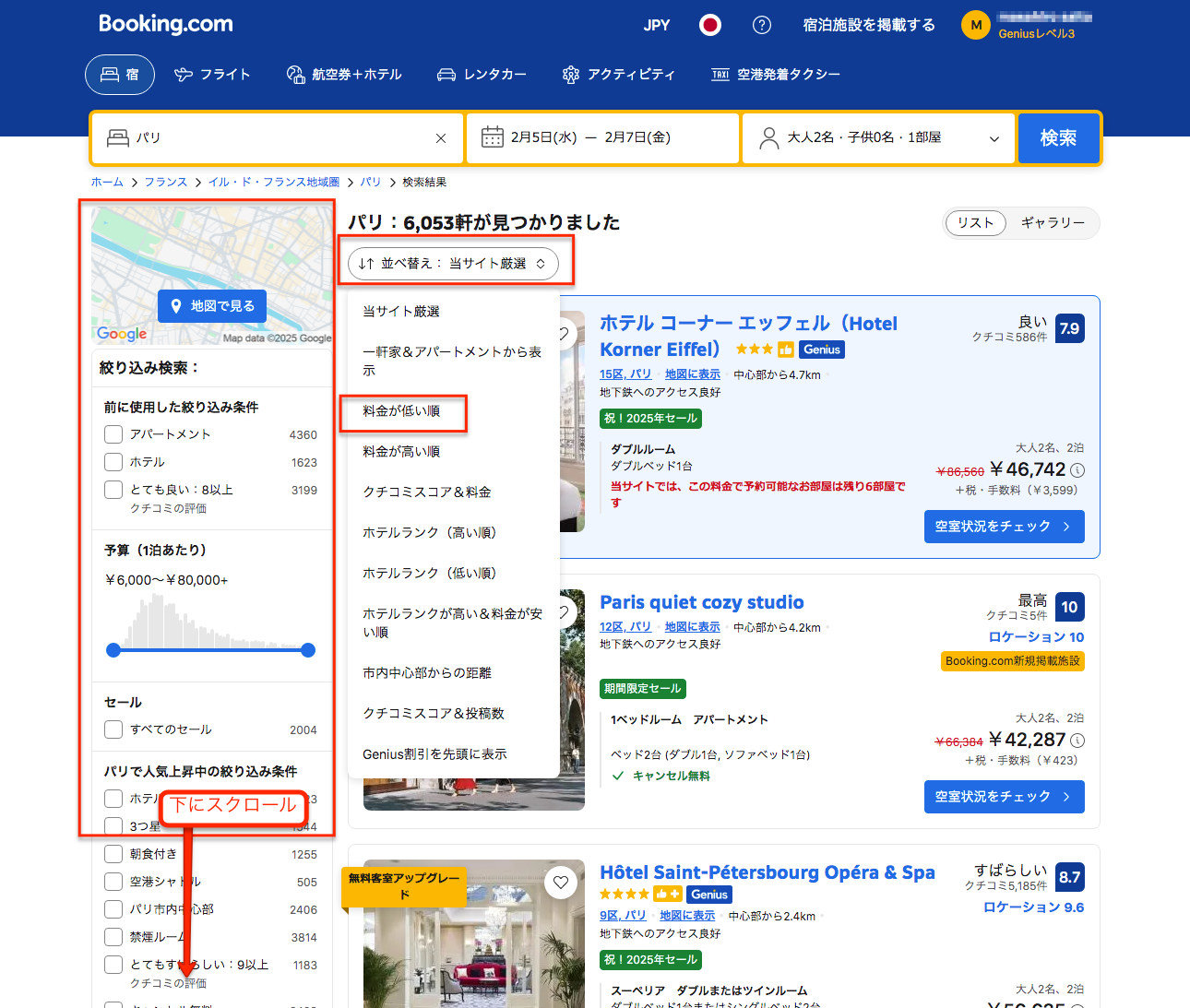 「パリ」(執筆時から約1か月後の)2月5日チェックイン、2月7日チェックアウトと入れて、検索をクリックします。