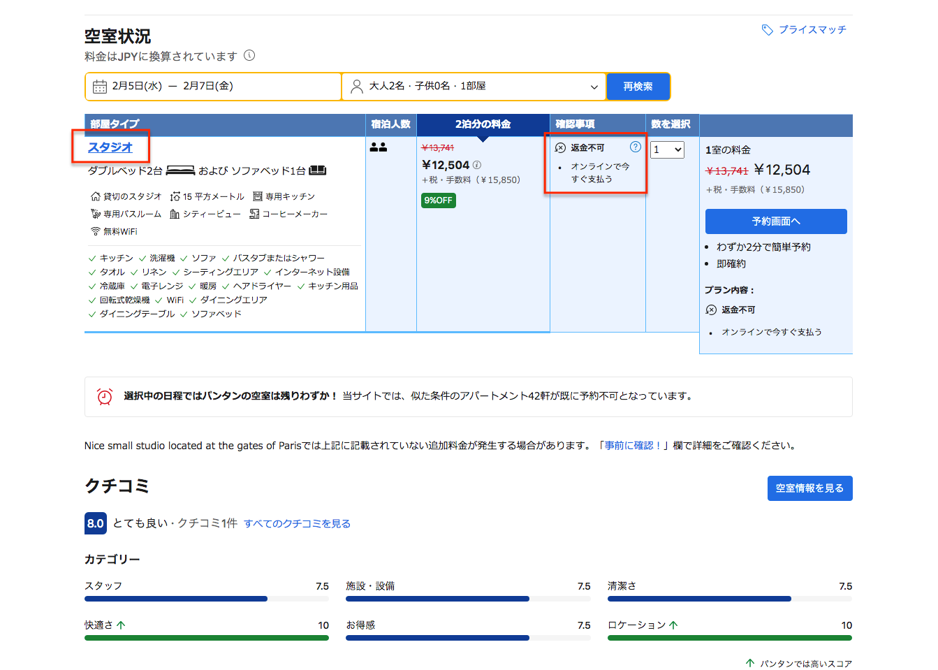 環状道路内の1軒をチェックすると2泊で13430円に税・手数料が2180円という施設がありました。合計しても15610円。パリで8000円程のプライスです。一人あたりであれば4000円程です。