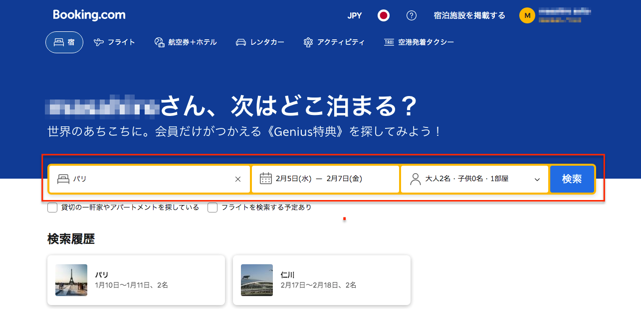 Booking.comのトップページに行くと、地域名、期日、人数構成を入力する画面になります。