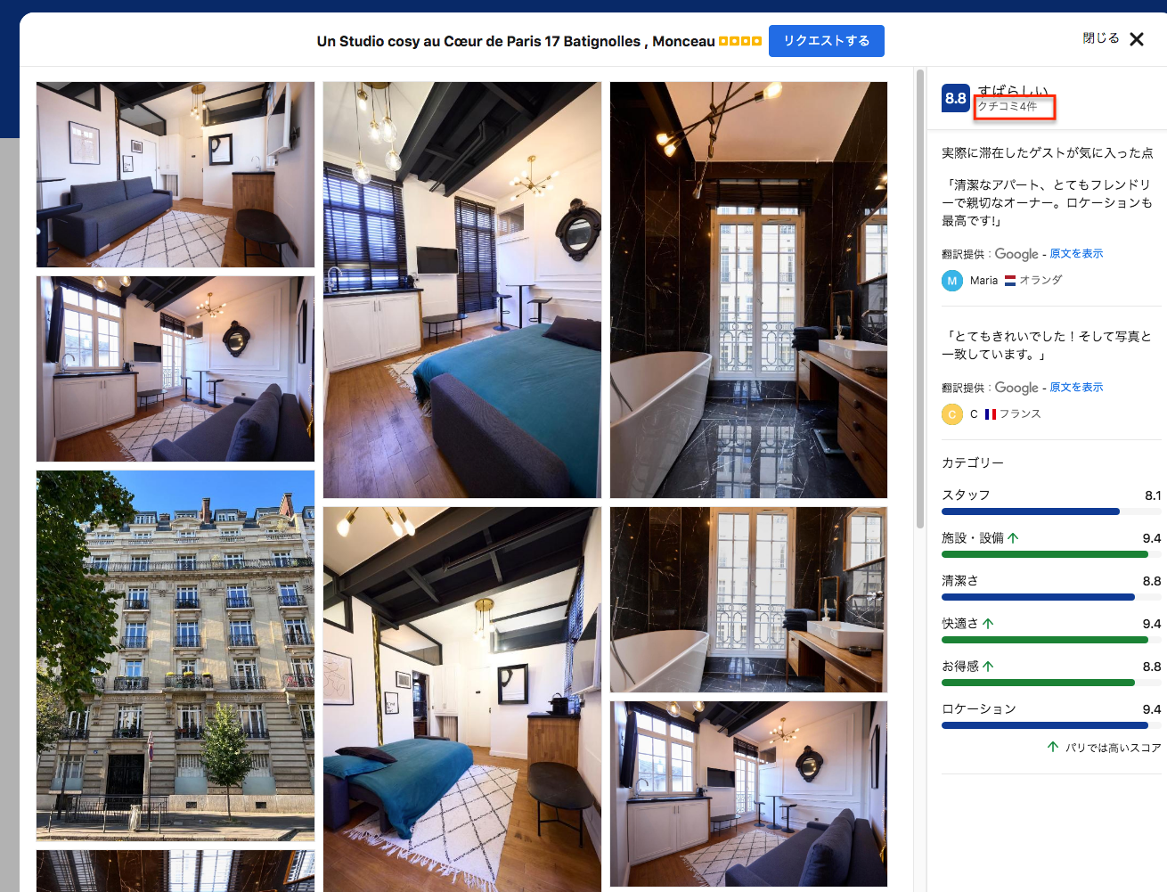 口コミの数は4軒とかなり少ないですが、写真を見るかぎり最近リフォームされた空間に見えます。窓際のバスタブはパリっぽいですね。